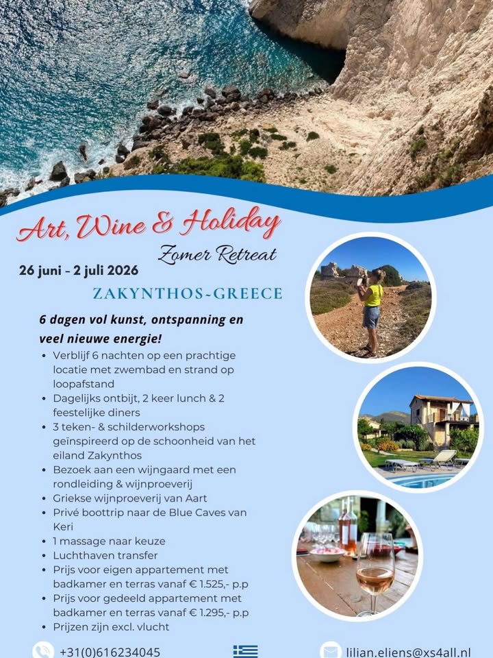 Zakynthos Art & Holiday Spread the love for ZanteSpread the love for ZanteZakynthos Art & Holiday juni 2026. Ontdek je creativiteit tijdens workshops, geniet van massages , wijnproeverijen en laad op in de betoverende omgeving van Zakynthos ����� Deze vakantie is voor iedereen de met een open blik wil creëren, ontdekken en genieten � Max 8 deelnemers, stuur even een berichtje naar [email protected] […] Spread the love for Zante