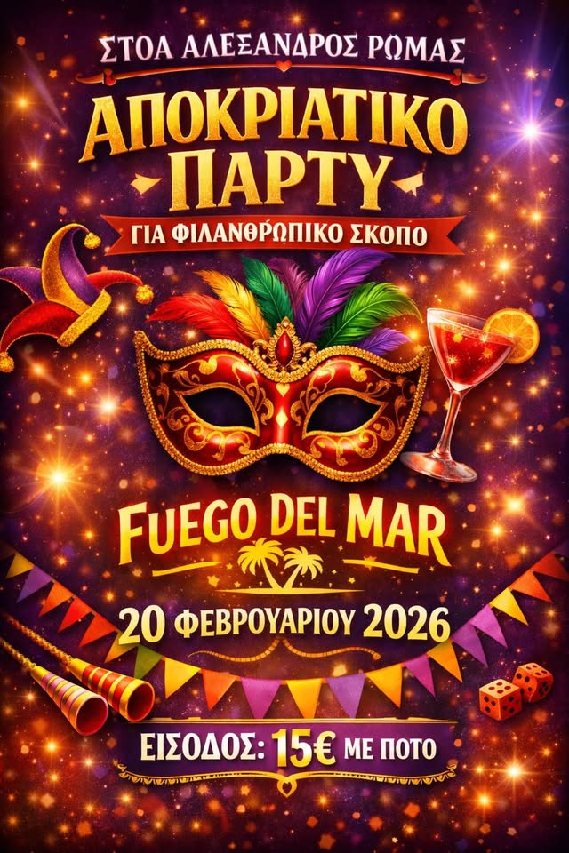 Αποκριάτικο Φιλανθρωπικό Πάρτυ Spread the love for ZanteSpread the love for ZanteΜετά την ιδιαίτερα επιτυχημένη περσινή αντίστοιχη εκδήλωση της Στοάς, κατά την οποία τα έσοδα διατέθηκαν για την ενίσχυση του Κοινωνικού Φαρμακείου του Δήμου Ζακύνθου καθώς και για τη στήριξη οικογένειας συμπολίτη μας που είχε ανάγκη να υποβληθεί σε χειρουργική επέμβαση, επανερχόμαστε και φέτος με τον ίδιο σκοπό και το ίδιο όραμα. […] Spread the love for Zante
